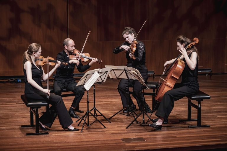 Het kwartet is het Nationaal Muziekinstrumentenfonds (NMF) dankbaar voor het in bruikleen geven van Dmitry’s vioolstrijkstok en Emma’s cello.